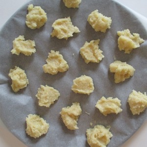 Place du papier sulfurisé sur la plaque du four et dépose des cuillerées de pâte espacées. Option : utilise une poche à douille pour donner un effet tournant à chaque pâté. Ça fait plus pro mais ça n’ajoute rien au goût ! Tu peux aussi coller une amande ou un petit morceau de fruit confit dessus.