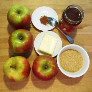 Lave 4 pommes “rustiques” (reine de rainette en l’occurrence), essuie-les, évide soigneusement cœur et pépins, mais sans les transpercer complètement.