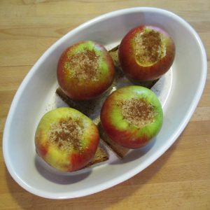 Beurre un plat à four, dispose les pommes sur les tranches de pain de campagne (Poilâne, par exemple), cavités en haut. Remplis chaque cavité successivement d’une cuillère à café de miel, de beurre, de cassonade et d’une pincée de cannelle.