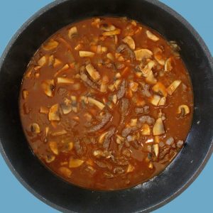 Dans une grande sauteuse, fais revenir les oignons émincés dans le ShMALTs plus un filet d’huile, puis la viande émincée, à dorer sur feu vif. Ajoute les champignons en tranches, l’ail haché, saupoudre paprika, sucre, sel, poivre, puis verse le bouillon à la tomate en remuant. Laisse mijoter 12 à 15 min à frémissement, en remuant de temps en temps.