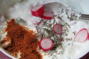 Émincez les radis en tranches fines, les oignons blancs, ajoutez le fromage blanc et assaisonnez avec sel, poivre et paprika selon votre goût mais franchement.