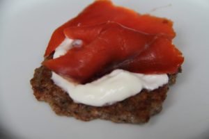 Avec une cuiller à soupe bien pleine faire des beignets dans la poêle. Cuire rapidement. Posez sur du papier cuisine absorbant. Laisser les beignets perdre un peu de leur chaleur. Quand ils sont tièdes garnir avec de la crème fraiche ou du fromage blanc aux herbes selon votre goût. Si vous trouvez de l’aneth (koper) vous le ciselez dans la crème fraiche ou le fromage blanc.