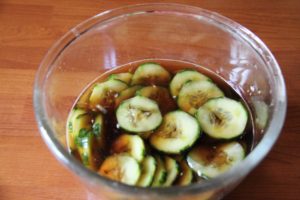 Ce n’est pas grand-chose juste un parfum d’enfance : quand il y avait un rôti de veau il y avait en accompagnement des concombres au vinaigre sucré. Mais vous pouvez très bien le faire en hors d’œuvre.