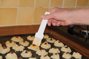 Vous ajoutez le blanc d’œuf pour obtenir une pâte de la consistance d’une pâte à choux, c’est-à-dire une pâte qui passera facilement dans la poche à douilles mais qui ne continuera pas à s’étaler une fois qu’elle est déposée