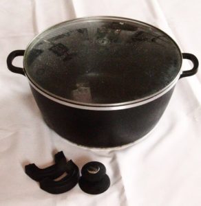 -Personnellement je me suis acheté une marmite à soupe qui n’est pas faite pour cet usage mais ça marche très bien. Ça monte à 90 – 95 °C et c’est juste la température qu’il faut. Et la contenance est intéressante : 9 L. Si vous faites un pot au feu vous apprécierez ce volume. Je surveille avec un thermomètre à sonde (photo).
