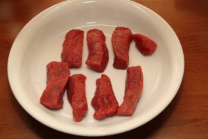 – Couper le rumsteck en bandes de 5 cm de long sur 1×1 cm. Réserver.