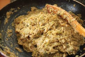 – A ce moment vous ajoutez la Maïzena et vous mélangez bien le tout. Chauffer quelques minutes pour que la Maïzena s‘empâte. La maïzena va absorber le reliquat de liquide. Réservez.