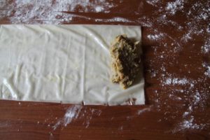 – Étalez une pâte à Filo sur le plan de travail fariné et vous la passez au pinceau trempé dans le beurre fondu