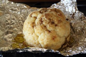 – Vérifier avec un couteau pointu que le chou est bien tendre, ouvrir le papier d’alu et saler, poivrer, mettre les épices et un filet d’huile d’olive.