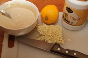 Rajouter doucement de l’eau en tournant avec une fourchette, la purée va s’empâter. Continuer à verser doucement de l’eau. Il arrive un moment ou le mélange devient moins épais. A ce moment rajouter le jus d’un citron, 4 gousses d’ail écrasées ou émincées fin, et les épices cumin et coriandre en poudre puis rajouter encore de l’eau éventuellement si vous estimez que la sauce est trop épaisse.