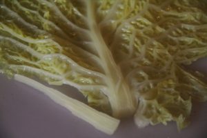Avec un couteau de cuisine bien affûté et à plat vous enlevez délicatement la côte centrale du chou en prenant soin de ne pas couper la feuille en deux.
