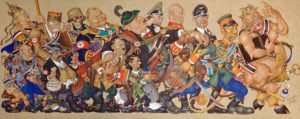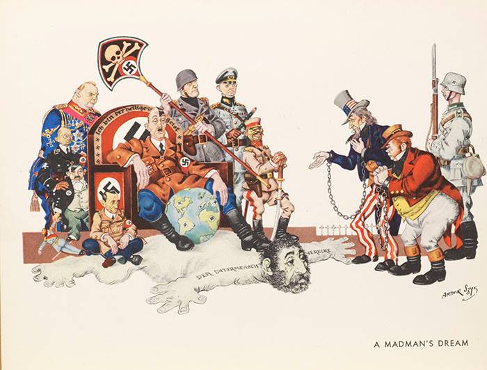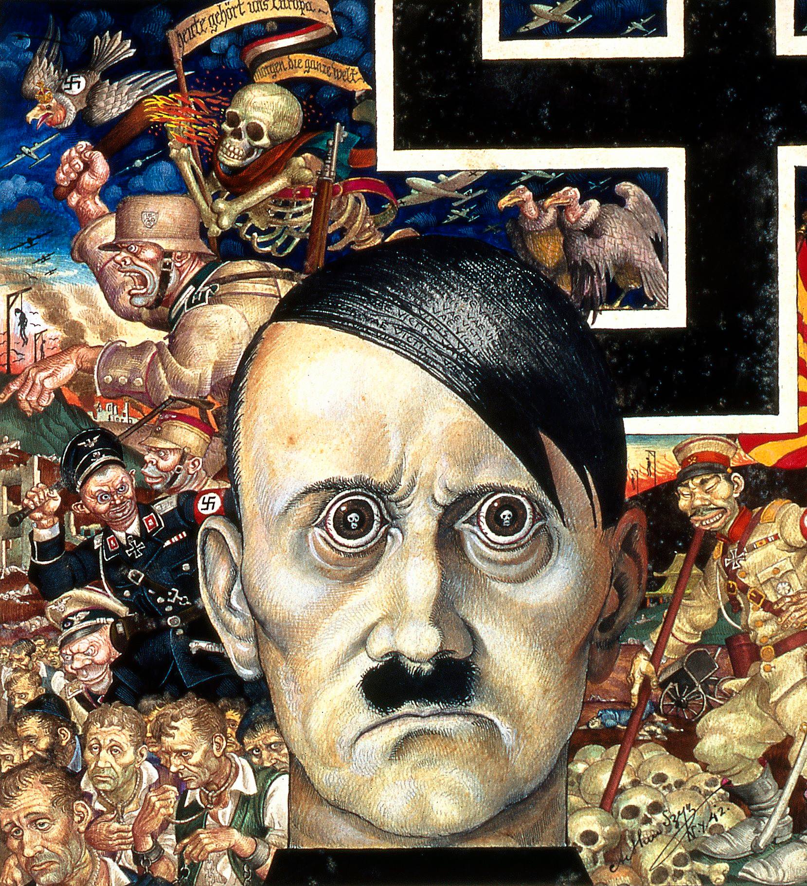 L’une des peintures les plus célèbres est intitulée, « A Madman’s Dream ». Il contient des caricatures d’Adolf Hitler, Hermann Göring, Heinrich Himmler, Joseph Goebbels, Hideki Tojo, Pierre Laval, Henri-Philippe Pétain et Benito Mussolini. « En même temps que Hitler assis sur le tapis Untermensch – tandis que l’Oncle Sam et John Bull supplient enchaînés – apparaissent (à droite) Tojo, un maréchal allemand, Mussolini (avec un éventail), Göring, Himmler, Laval (avec une marionnette de Pétain) et Goebbels. (Le libellé sur le trône de Hitler indique: Je suis le Saint-Esprit.). »