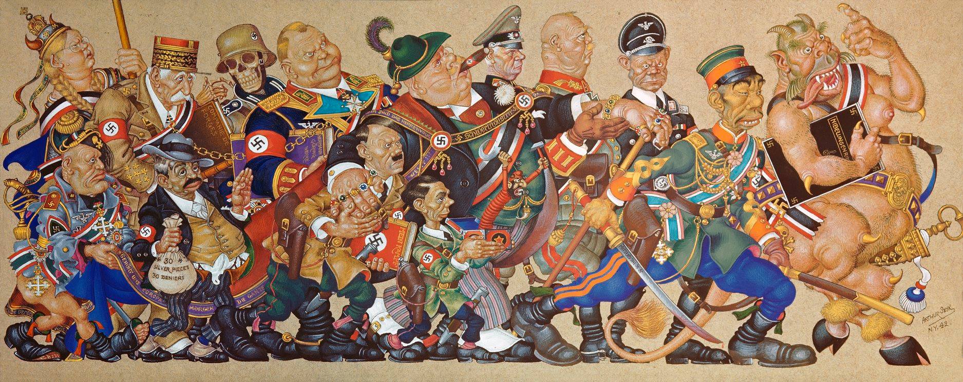 Une anthologie des peintures anti-fascistes de Szyk paraît dans son livre, « The New Order » en 1940. Selon un critique: « Szyk exploite les vertus plus grossières de la caricature pour enfoncer son point de vue dans la tête des spectateurs de telle sorte que personne ne puisse se perdre dans la détails exquis d’un dessin, avant d’avoir assimilé l’idée principale. »