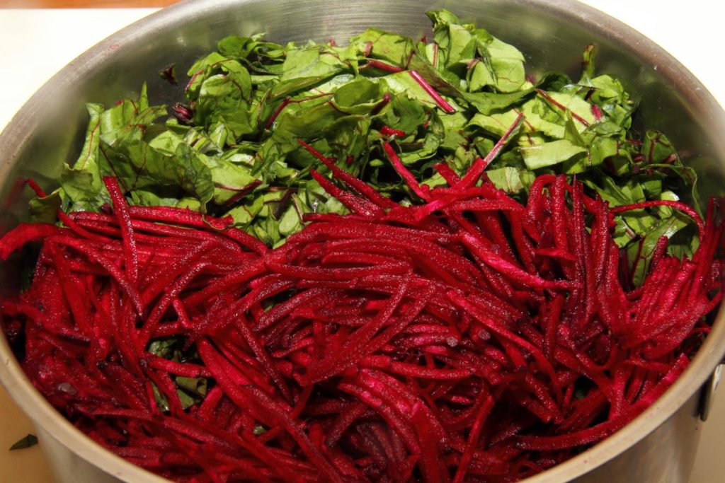 – Si vous avez trouvé une botte de betteraves avec ses feuilles vous lavez la botte en entier, vous enlevez les tiges de feuilles et vous les émincez finement. Vous épluchez les betteraves et vous les râpez.