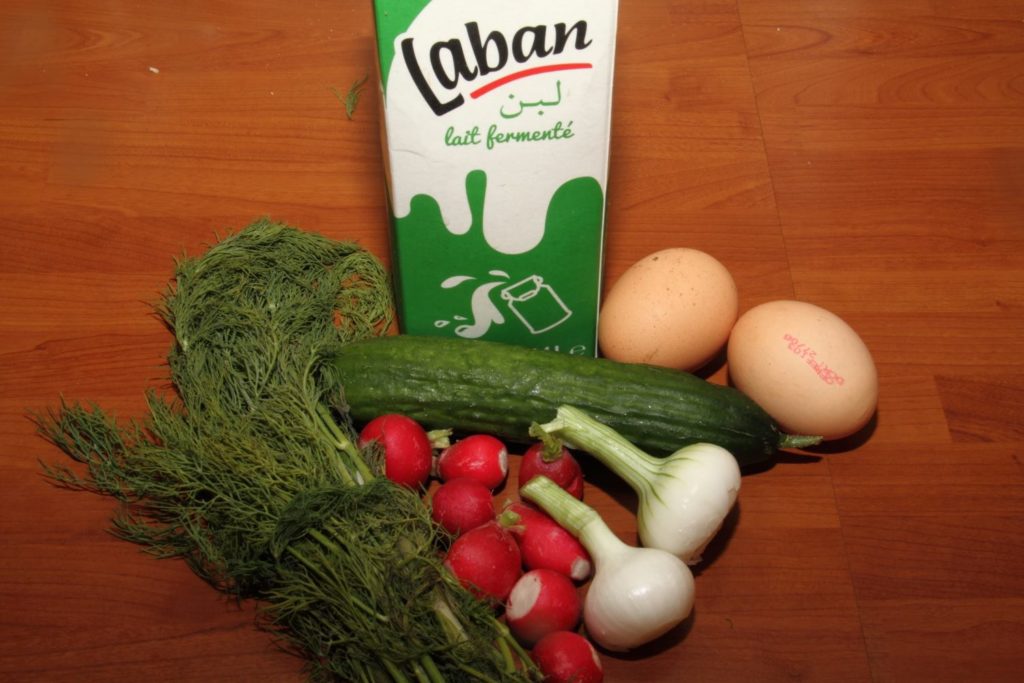 – Le concombre, les radis émincés, les oignons frais, l’aneth et en dernier les œufs coupés en 2