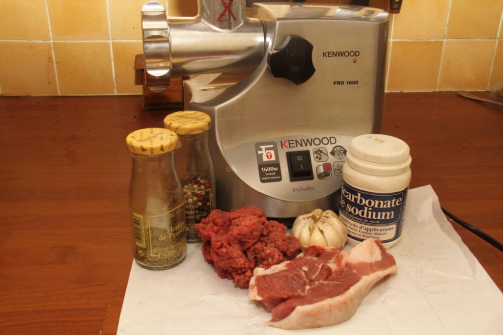 Avec la grille fine de votre hachoir passer tous les ingrédients et la viandede bœuf une 2eme fois. Ajouter la cuiller de bicarbonate. Bien mélanger avec une fourchette et ajouter quelques cuillers à soupe d’eau pour alléger le mélange qui doit quand même rester ferme.