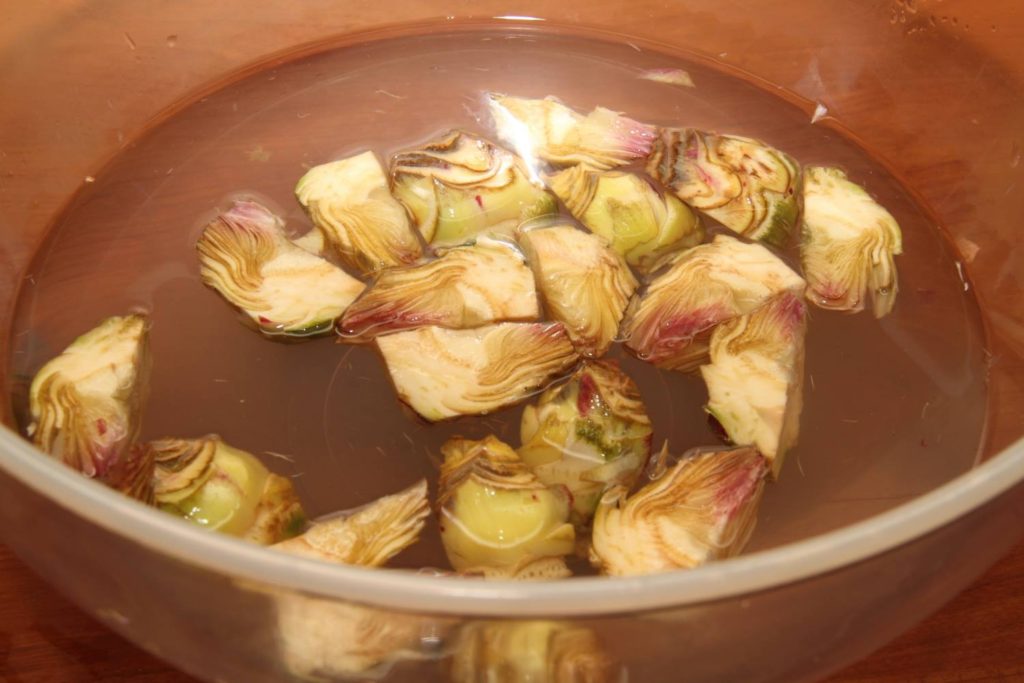Couper les artichauts tournés en 4 et les mette dans l’eau froide. Vous mettez dans l’eau du « citron » en bouteille pour éviter aux artichauts des’oxyder