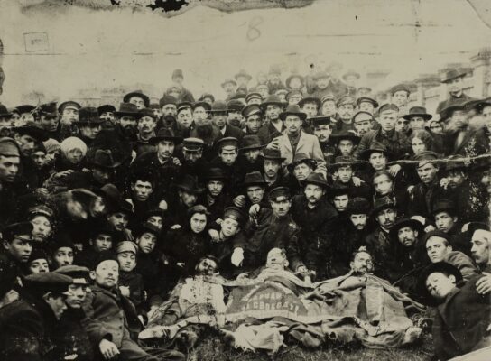 (Illustration: groupe d’autodéfense du Bund autour de victimes du pogrom)